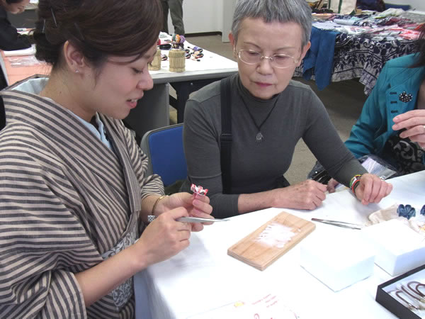 生憎のお天気の中多くのお客様にお越しいただき、本当に嬉しかったです。例年通り「つまみかんざし彩野」コーナーでは、作品販売とワークショップをやらせていただきました。なんと今年は最年少5歳の男の子もワークショップにご参加いただき、見事完成しましたよ!出来上がったヘアピンは、後日お母様が七五三の際のお着物姿に合わせて着けてくださったそうです。素敵なお話に感動☆その他にもたまたま当日イベントのことを知って来てくださった方、2年連続でご参加いただいた方、私のアルバイト先である着物屋のお客様もいらっしゃったりと、笑いの絶えない賑々しい一日となりました。