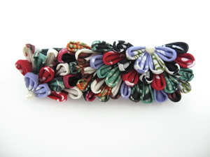 ジャワ更紗(バティック)を使って横長のブローチを、というご注文で作らせていただきました。更紗の色々な端切れを使い、夏にぴったりのカラフルな作品にしました。