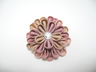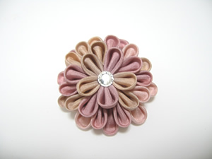 羽織を仕立てられた方からのオーダーで、羽裏の端切れを使いブローチを作りました。ストールを留めたりするのに使われるそうで、あまり和風にならないように花の中心にはスワロフスキーを使いました。