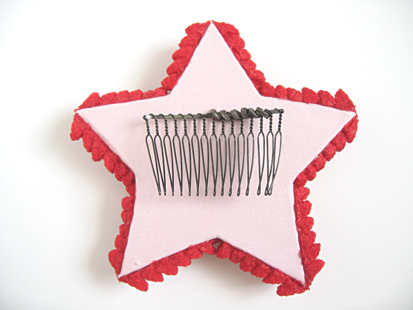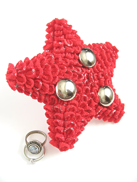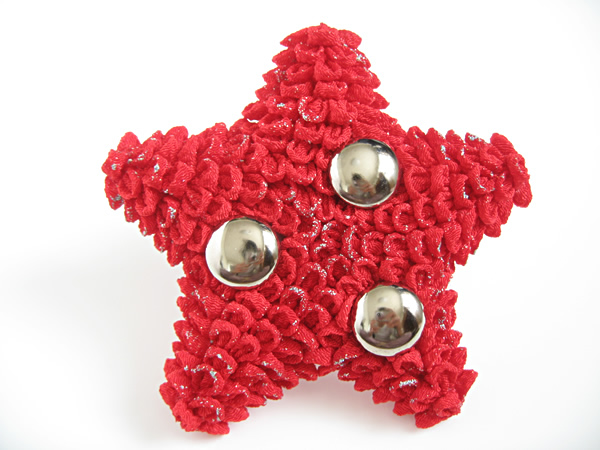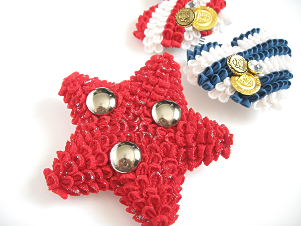 "背景が真っ赤で、真っ黒の服を着せたモデルを、かっこいい風に撮りたい"というカメラマンの希望をもとに作った作品です。つまみの柔らかさを消したくて、シルバーのラメを部分的に散らしています。実はシルバーの四角いスタッズを入れようと思っていたのですが、イメージのものがなく、百歩譲って丸いボタンに。