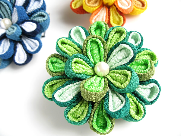 レーヨンのちりめんの扱い方が分かったので、4タイプ作ってみました。緑色の大きい花を初めて作ってみました。ツウ好み(?)です。