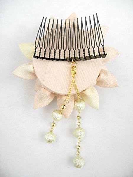 春らしい色合いの大きめな髪飾りです。花の中心と枝垂れに使っているパールは「シュガーパール」という表面がボコボコしているものを使ってみました。