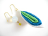 「変わったデザインのピアスを」とのご要望で、大胆な作品を作りました。3色の生地を合わせて「つまみ」を一つ作り、対にはそれぞれのイメージに合うビーズを組み合わせています。話題になること間違いなし(?)のピアスです。
