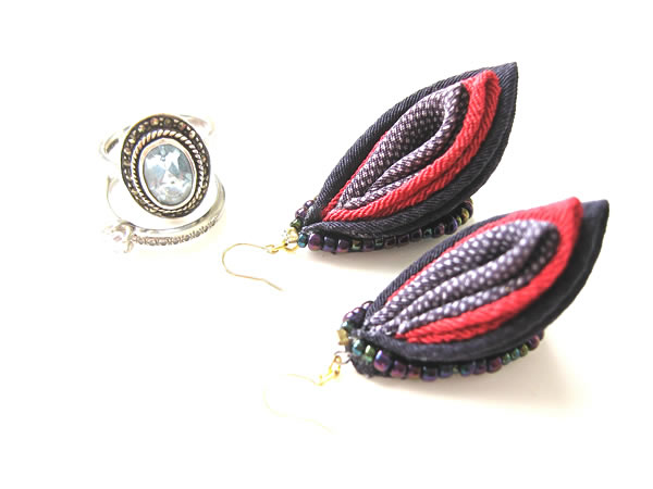 お持ち込みの江戸小紋と友禅小紋の端切れを使いピアスを作らせていただきました。過去に作った「孔雀」より一回り小さくし、差し色に落ち着いた赤を入れました。