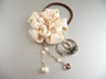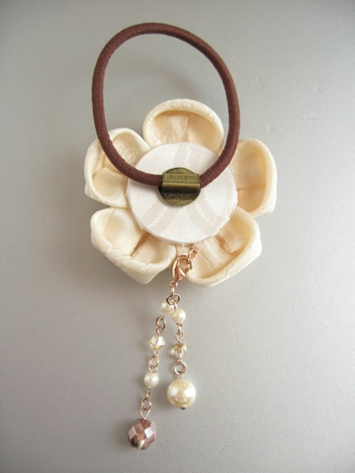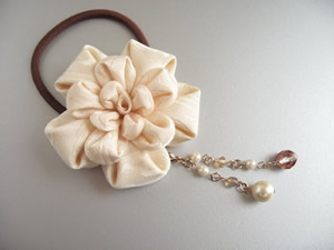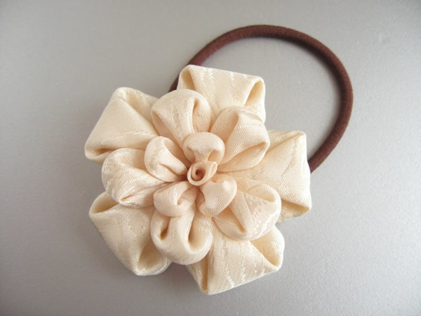 少し大きめの花が付いたヘアゴムを、とのご依頼で作りました。「柔らかい」「ふわっとした」イメージで、ということで、花びらの形や色合いを工夫しました。