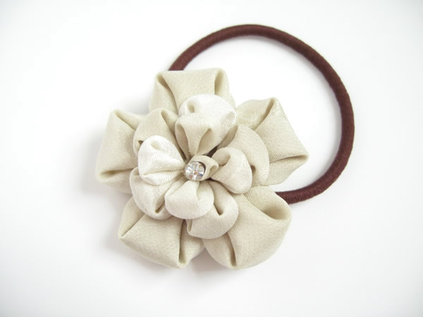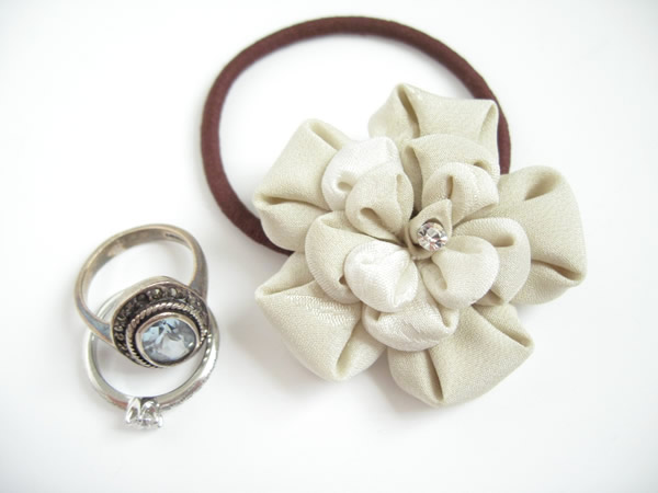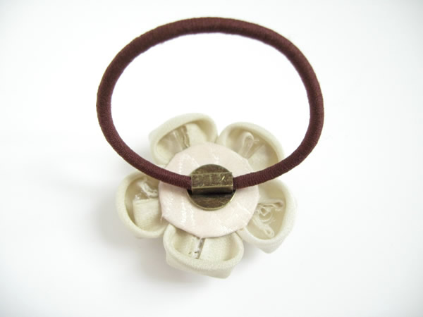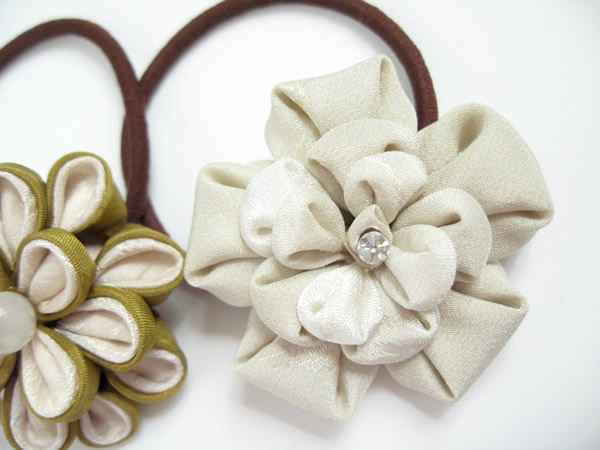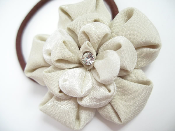 春日部の美容室「ami」さん経由でオーダーいただきました。「輝響」の様なデザインのヘアゴムを、アースカラーで、というご注文でした。花とのバランスを考えて今回はスワロフスキーを一つだけ使用し、控えめながらもきちんと存在感もある作品にしました。