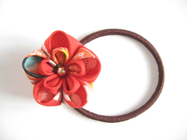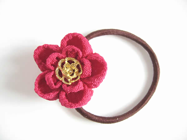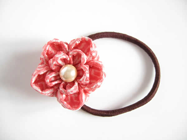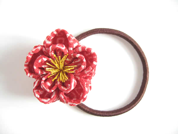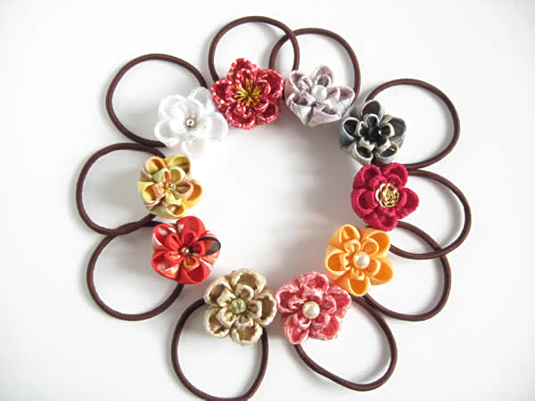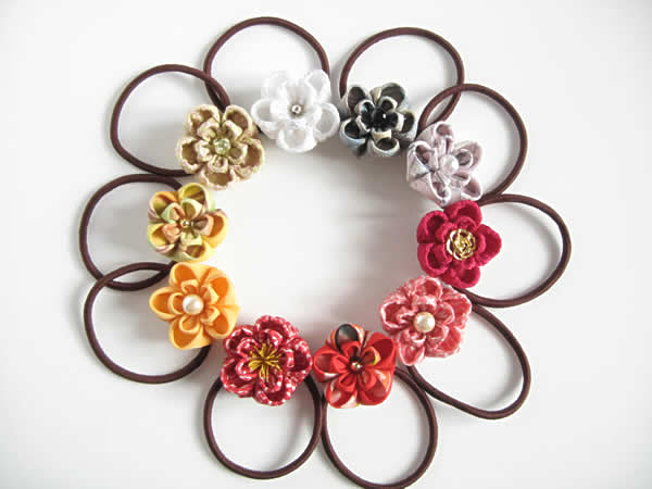 シルク(縮緬、着物端切れ)、コットン、パール(模造)、ビーズ、金糸、ボタン、ラメ