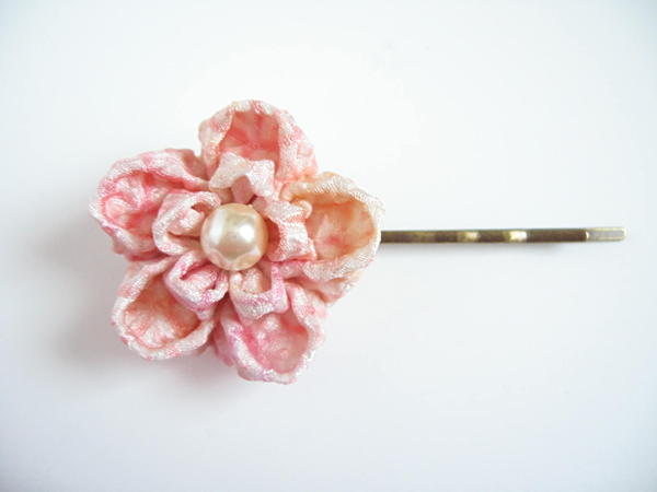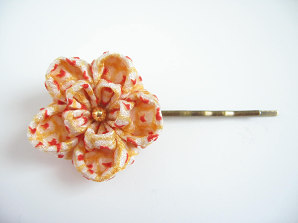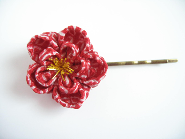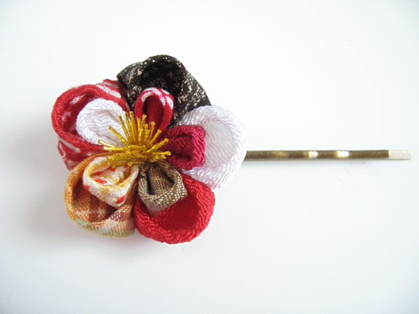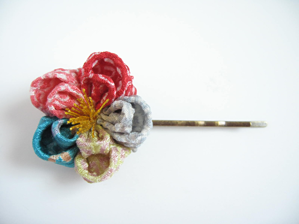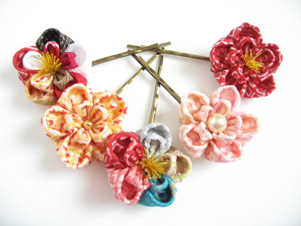 定番のヘアピンです。とても好評なので再度作りました。今回は花びら一枚一枚全て違う生地を使ったものもあります!