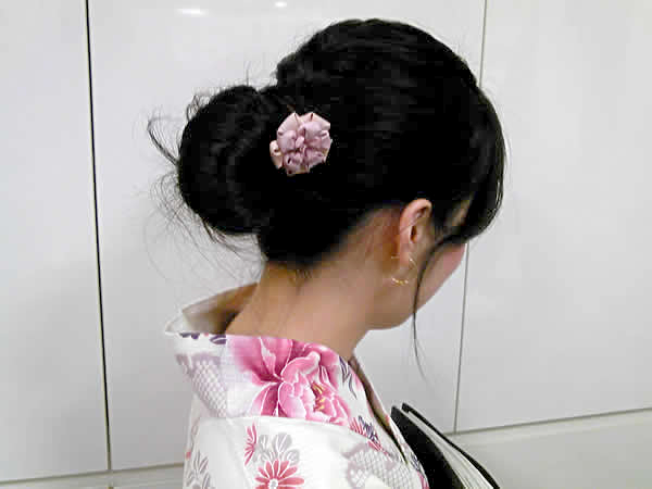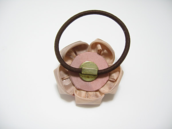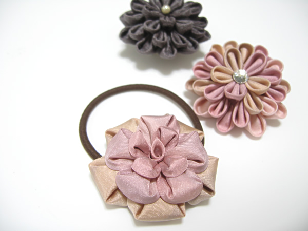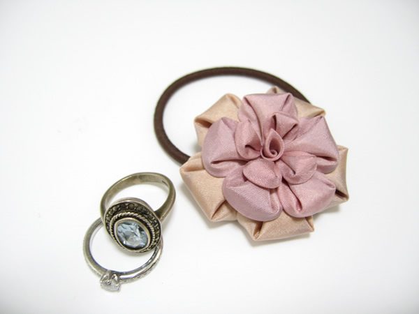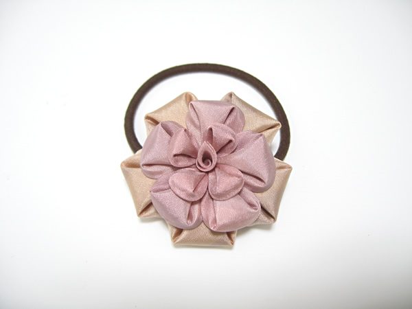 羽織を仕立てた方からのご依頼で、羽裏を使って洋服のときでも着けられるデザインのヘアゴムを作りました。生地の色がグラデーションになっていたので、花の外側に薄い色を使い、中心にいくにつれて色が濃くなっていくように作ってみました。