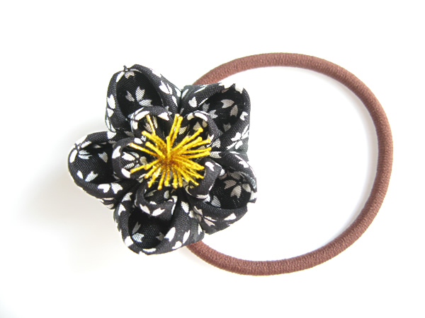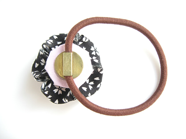 細かい桜柄の八掛の余り布を使って何か作れないかということで、ヘアゴムを作らせていただきました。花の中心に金糸を使ったので和風になりましたが、意外に洋服でも大丈夫でした。