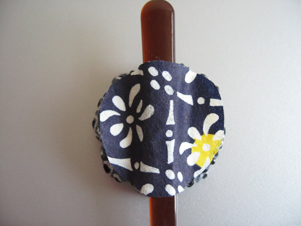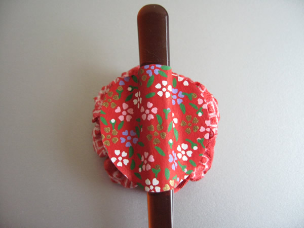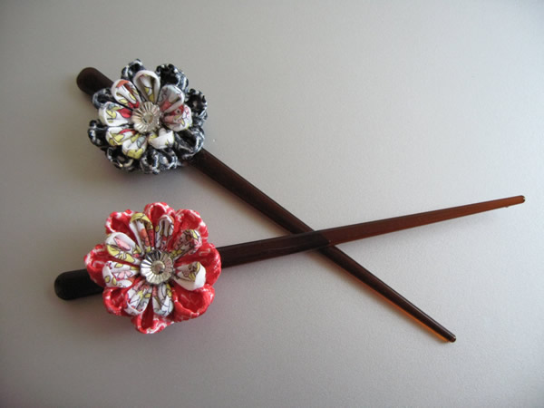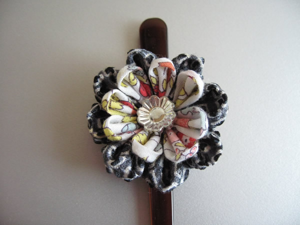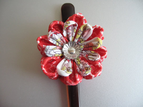 絞りの端切れと、花柄の綿素材の端切れ。素材もデザインも違う二種をあわせて作った花かんざしです。カジュアルな着物にも、普段のお洋服にも合わせやすいと思います。