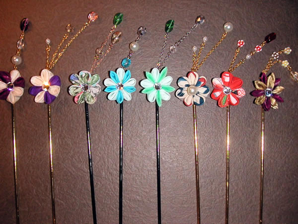 浴衣向けに作ったかんざしです。花の部分には、羽二重や古布を使っています。また、花の中心にはスワロフスキーを使っているものもあります。垂れ下がるビーズ部分も含め、一点一点のデザインがすべて異なり、同じものはありません。一本だけでも可愛いですが、二本あってもより華やかです。