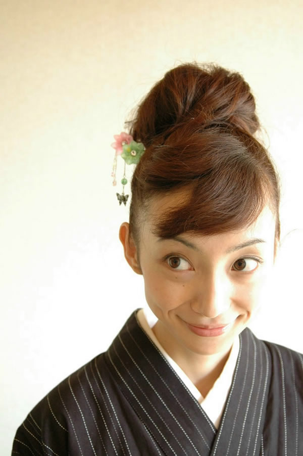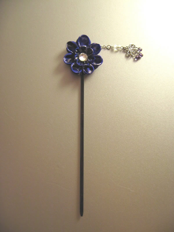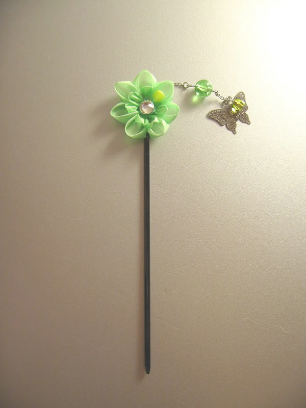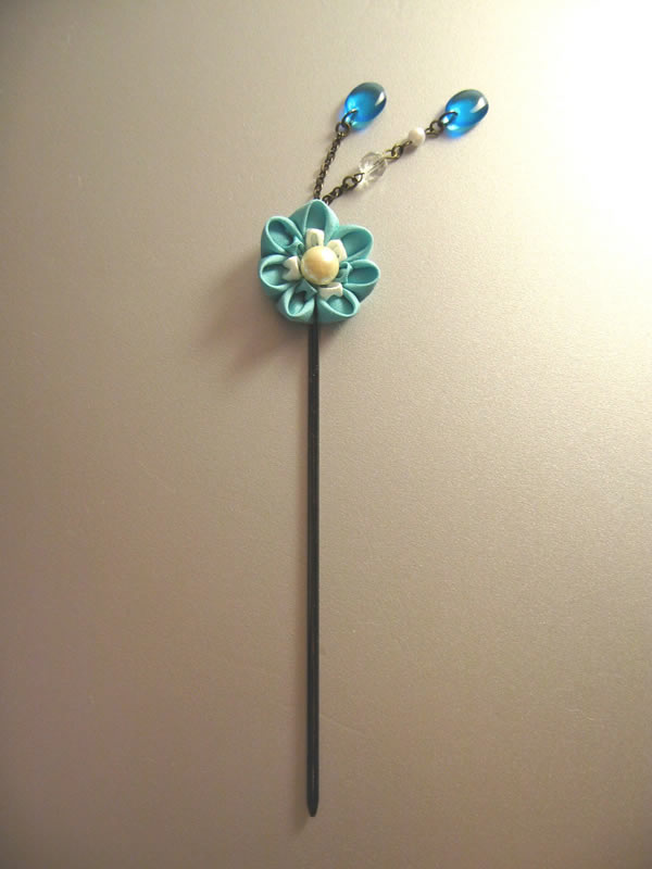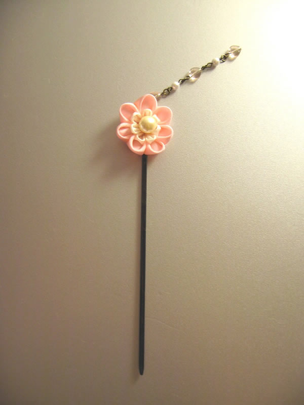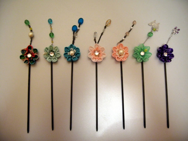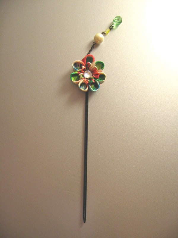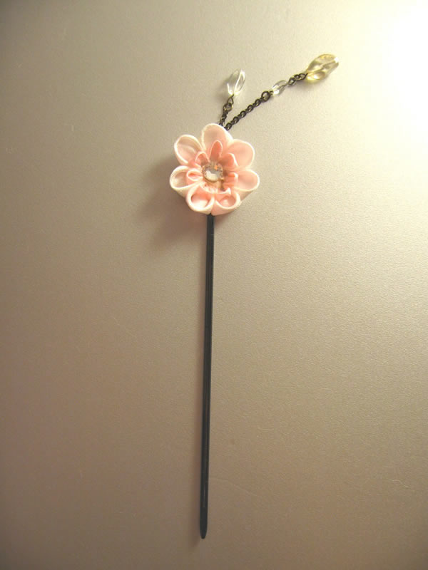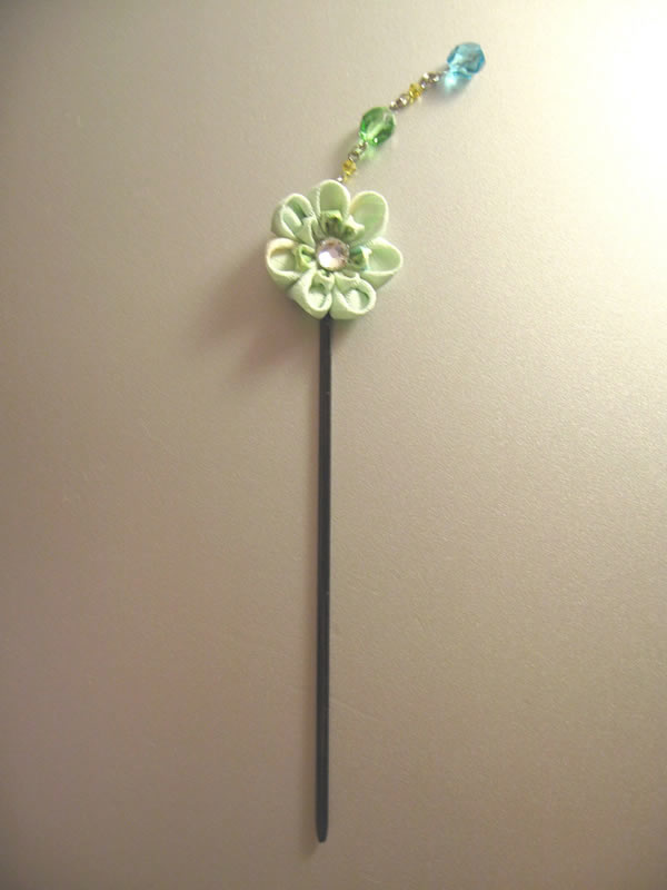 浴衣向けに作ったかんざしです。花の部分には、羽二重や古布を使っています。また、花の中心にはスワロフスキーを使っているものもあります。垂れ下がるビーズ部分も含め、一点一点のデザインがすべて異なり、同じものはありません。一本だけでも可愛いですが、二本あってもより華やかです。