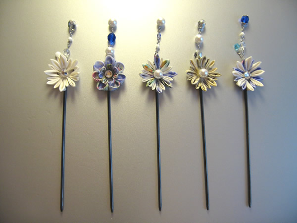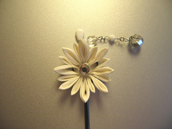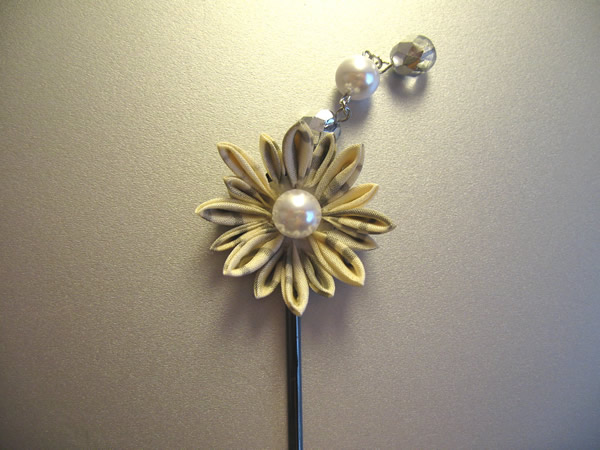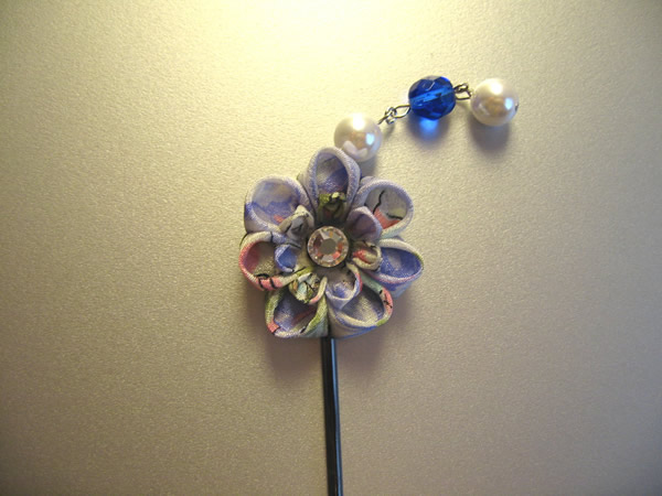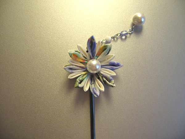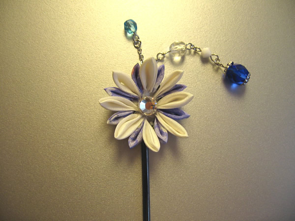 浴衣向けに作ったかんざしです。花の部分には、羽二重や古布を使っています。また、花の中心にはスワロフスキーを使っているものもあります。垂れ下がるビーズ部分も含め、一点一点のデザインがすべて異なり、同じものはありません。一本だけでも可愛いですが、二本あってもより華やかです。