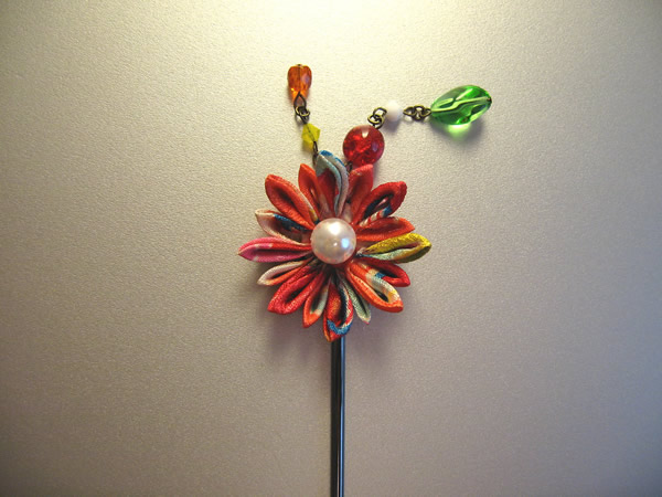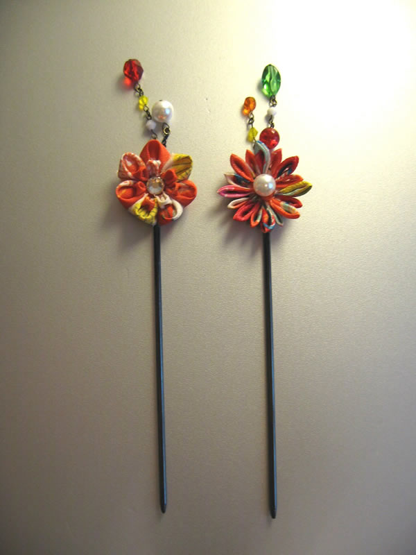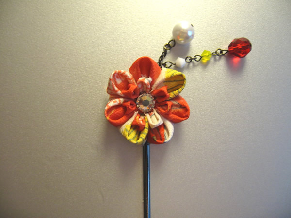 浴衣向けに作ったかんざしです。花の部分には、羽二重や古布を使っています。また、花の中心にはスワロフスキーを使っているものもあります。垂れ下がるビーズ部分も含め、一点一点のデザインがすべて異なり、同じものはありません。一本だけでも可愛いですが、二本あってもより華やかです。