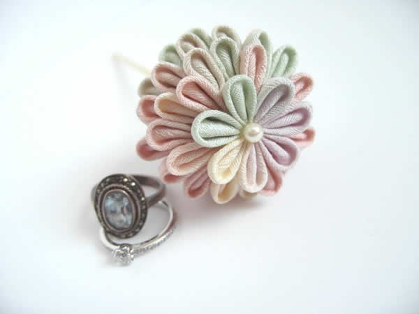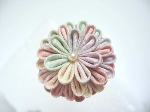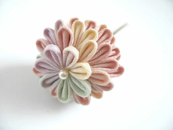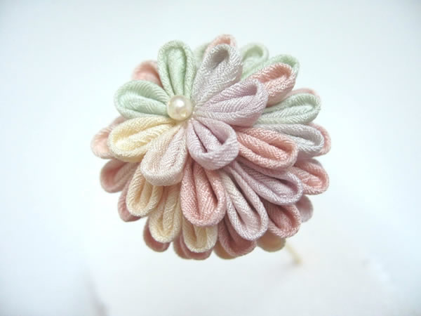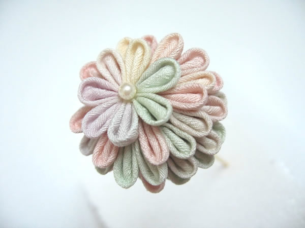 ぼかしで様々な色が染められている小紋の端切れが手に入ったので、考えた結果このデザインを作ってみました。とても柔らかな雰囲気で、春らしい作品になりました。