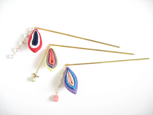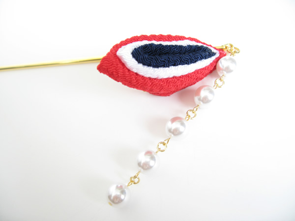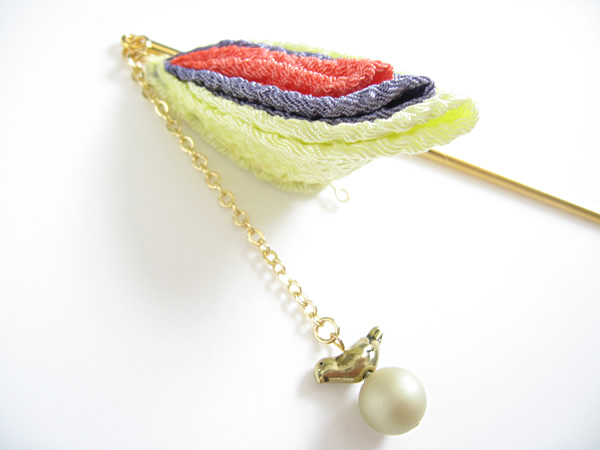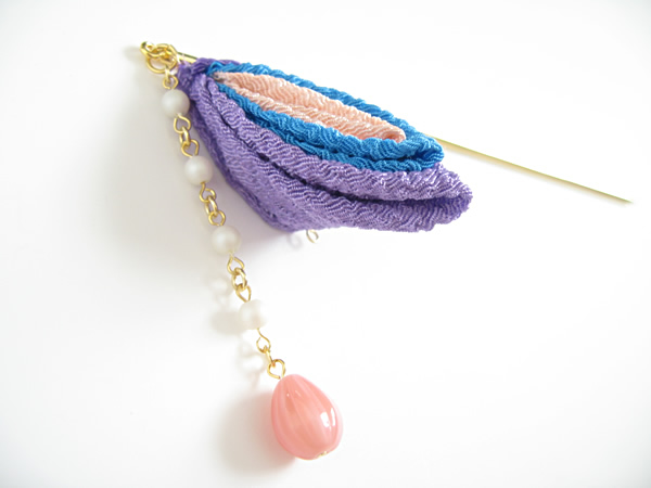 今まで作ったことのないデザインの一本挿しです。歩くたびにつまみやビーズが揺れ、動きのある作品になりました。お洋服姿にも浴衣姿にもオススメです。