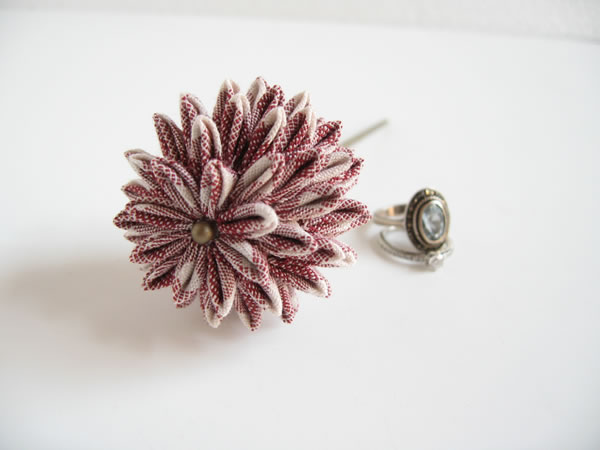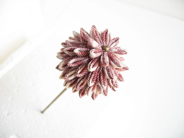 木綿のお着物を仕立てられた方からのオーダーです。端切れをお預かりし一本挿しを作らせていただきました。生地の持つ素朴な雰囲気を壊したくなかったので、金具や中心のパールの色を落ち着いたものにしました。