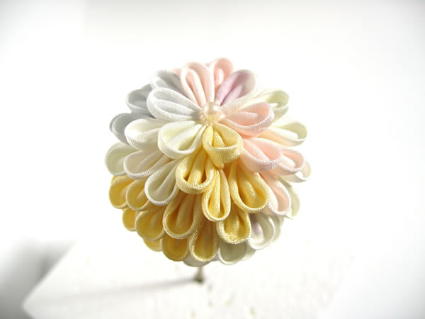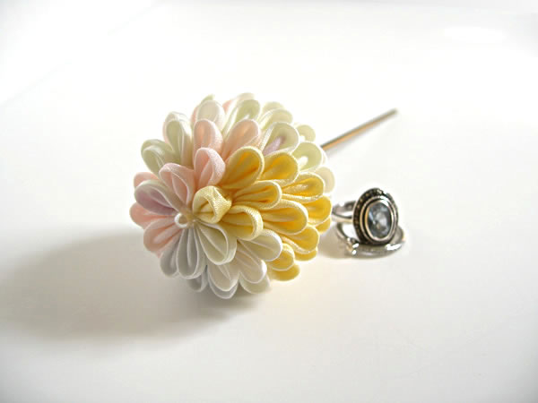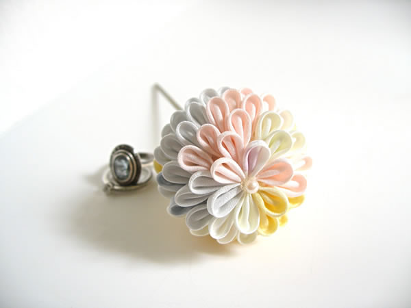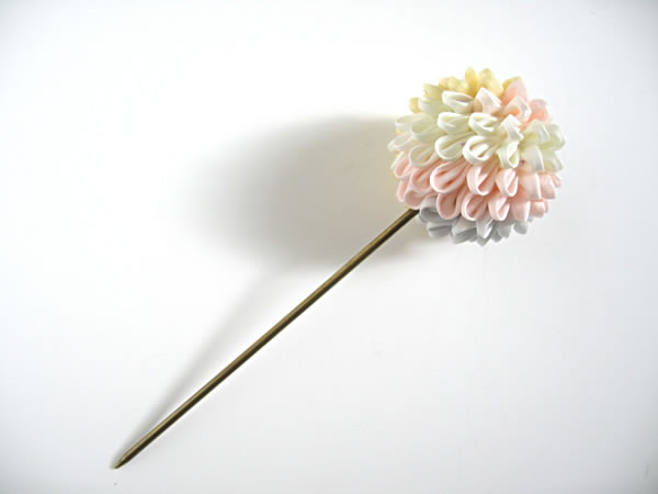 4種類の長襦袢の端切れを混ぜてカラフルな一本挿しを作らせていただきました。出す向きによって色合いが変わるので、その日の気分やコーディネートによって調整していただけます。金具の長さもちょうど良い、とお褒めのお言葉をいただきました!