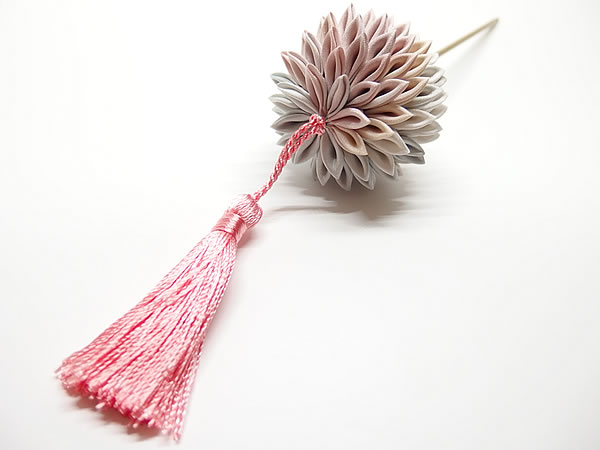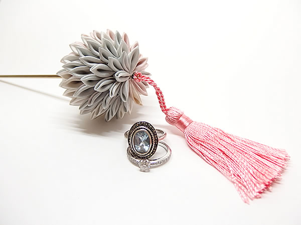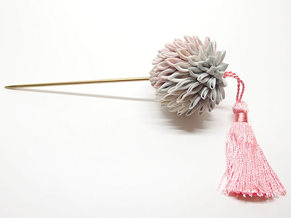 羽裏の余り布をお預かりして鞠型の一本挿しを作らせていただきました。このタイプは丸つまみで作る事が多いのですが、お客さまの熱いご要望により剣つまみで作りました。