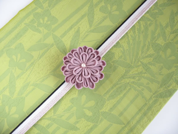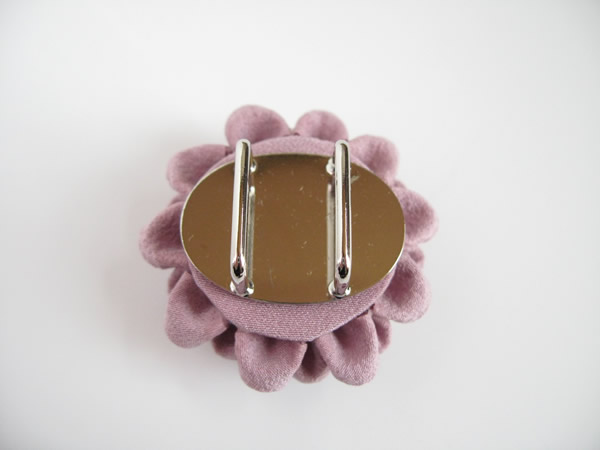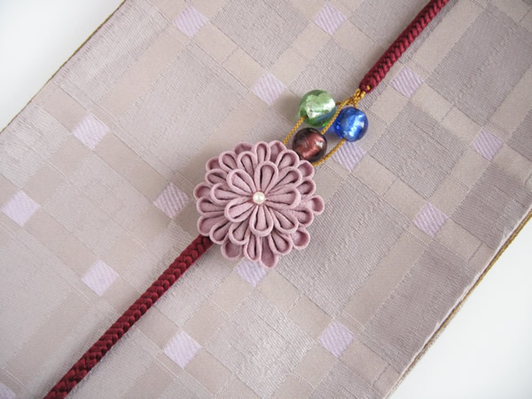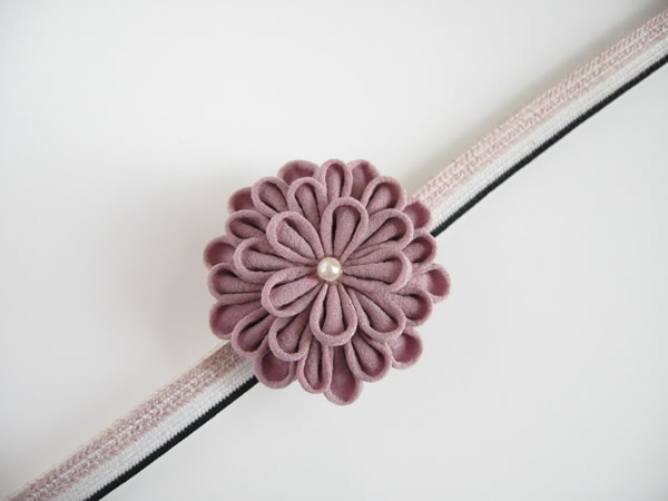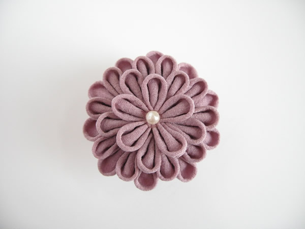 ご年配の方へのプレゼントとして作成。ご要望はシックな色で、他はおまかせ、との事でした。紫色は着物で人気のある色ですし、高貴な色とも言われているのでこの色に決めました。着物や帯に合わせやすいよう、色数をおさえたかったので、花の中心はパールにしました。