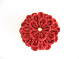 深みのある赤の生地を使い、秋冬向けの帯留めを作りました。