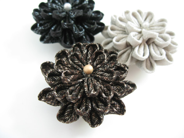 紬をお召しになる方に大好評の大島紬を使った帯留めです。今回は花の中心のパールの色をベージュにしてみました。