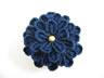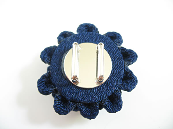 紺色の帯留めです。黒より強い印象になりずぎず、コーディネートを優しく引き締めてくれます。花の中心にはブラウンのパールを使っています。