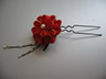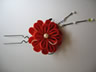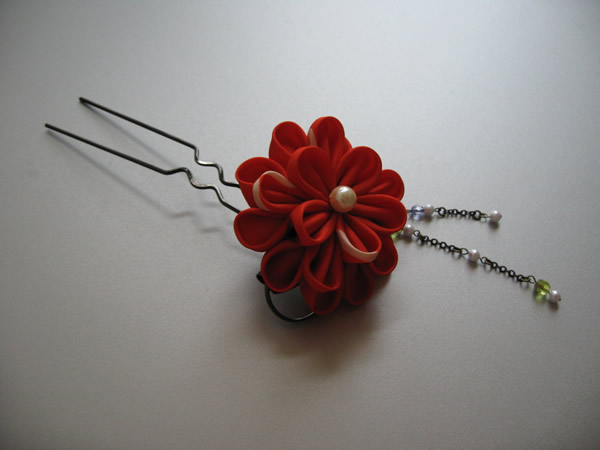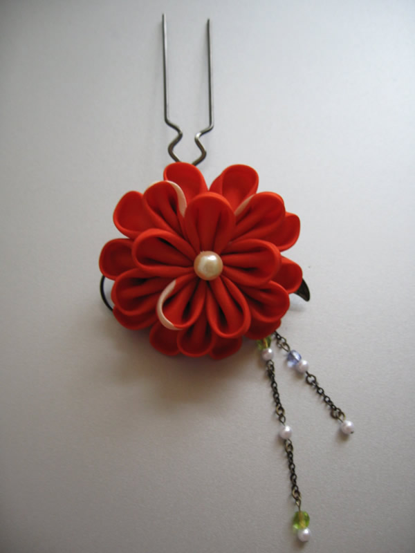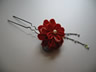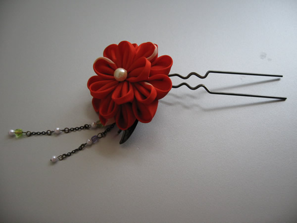 朱色の色無地に合わせて作った作品です。おめでたい席に着て行かれると言うお話だったので、落ち着いた印象を出す為に模造のパールを中心に使っています。また枝垂れ部分のビーズの色は、当日合わせる重ね衿や帯揚げの色から取りました。