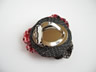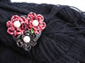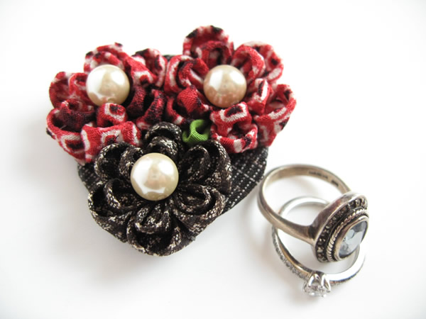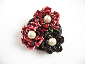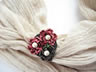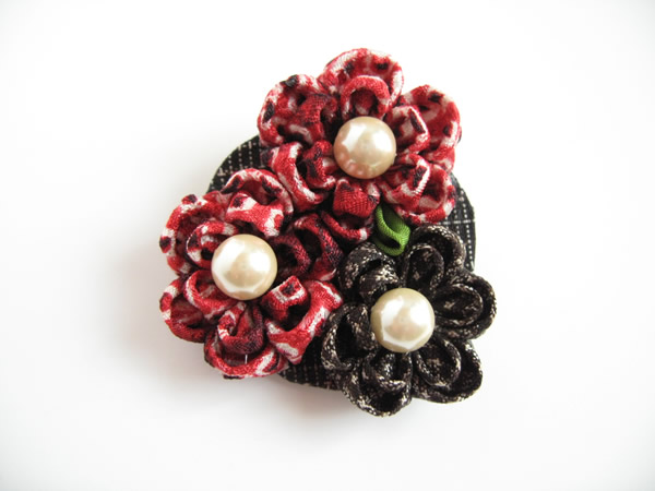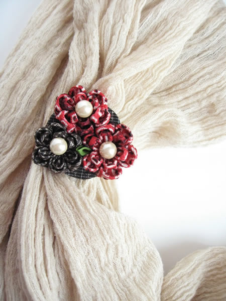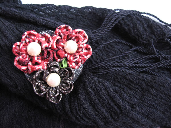 初めてスカーフ留めに挑戦してみました。赤に少し黒の入った絞りの生地と、大島紬の端切れを使い、派手過ぎない色合いにしました。バックやお洋服などのワンポイントにもお使いいただけます。