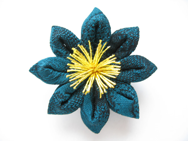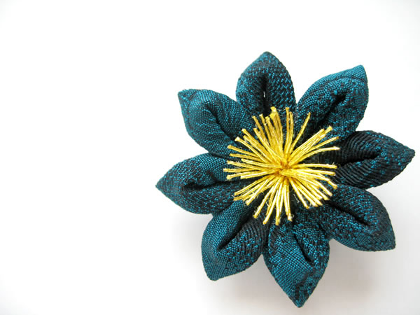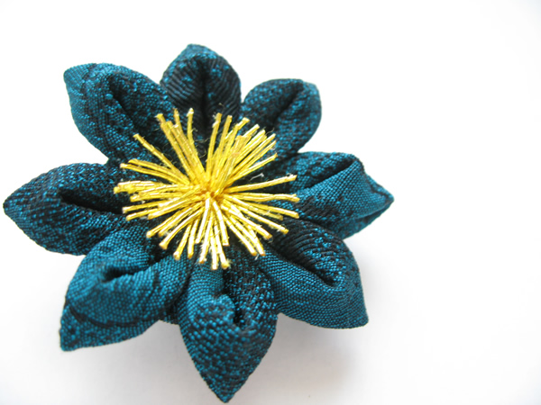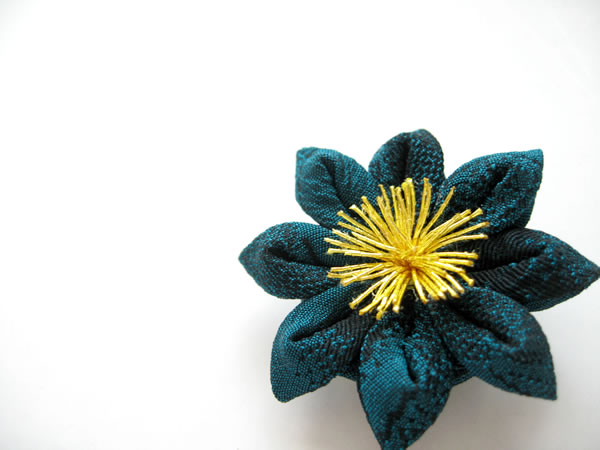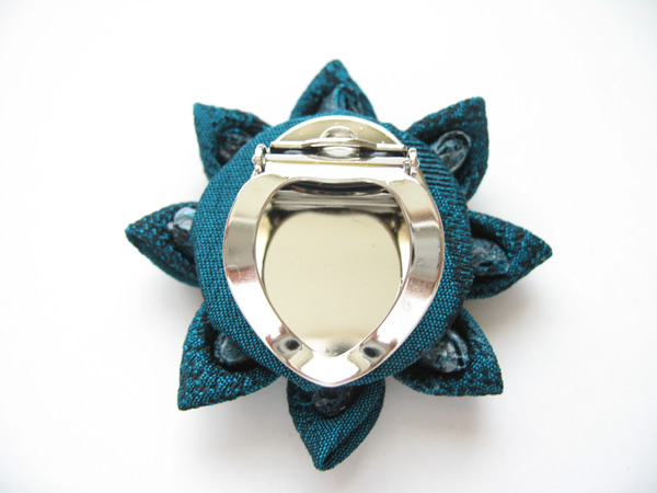 着物の端切れをお預かりして作らせていただいた作品です。デザインはご依頼主のご希望で「鉄線」の花をイメージして作りました。どんな太さの帯締めにもお使いいただけるよう、金具をあえてスカーフ留めにしています。