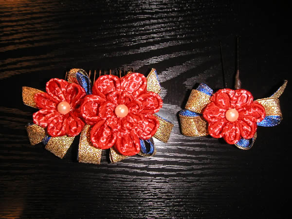 友人の振袖に合わせて作った作品です。紺地に赤の模様という振袖に合わせて、赤い絞りの古布を使用しました。ブルーと金のリボンがアクセントになっています。