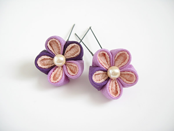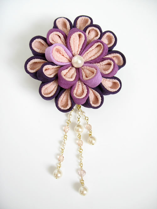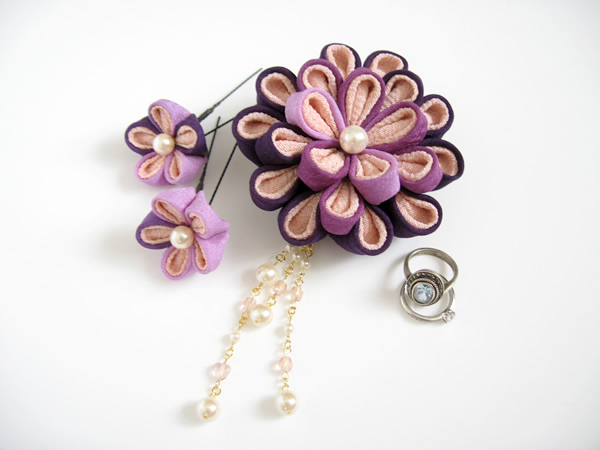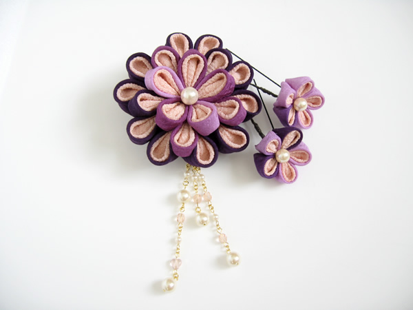紫色のお振袖に合わせたかんざしを、とのご注文で作らせていただきました。デザインや色合い、大きさなどは、ご本人様との打ち合わせで決めさせていただいています。紫の生地は、お振袖の端切れです。とても可愛らしい方なので、枝垂れ部分にハート型のビーズ一つをつけておきました。