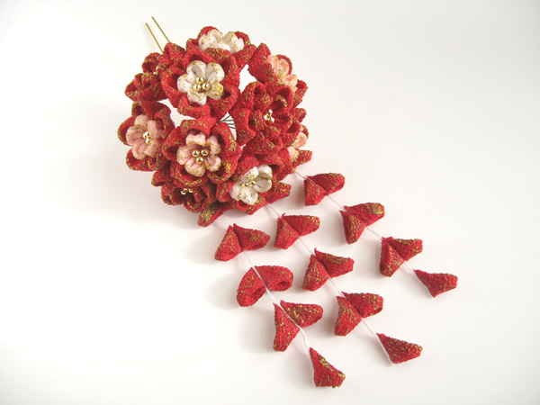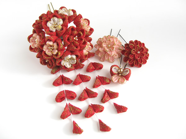 2月に挙式予定の方からのご依頼で作らせていただきました。様々な色の入っている内掛けをお召しになるという事でかんざしの色合いに悩みましたが、深みのある赤をメインにする事にし、あとはお任せさせていただきました。蝶を作ったのはご依頼主様からのご希望です。