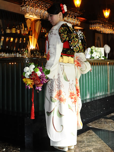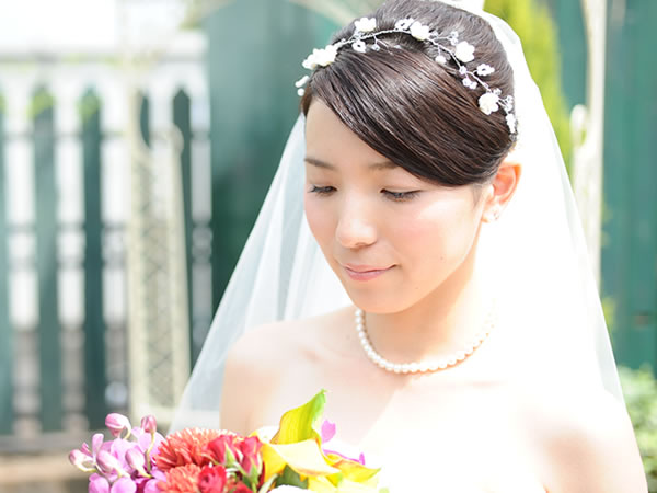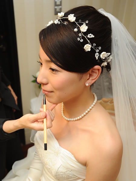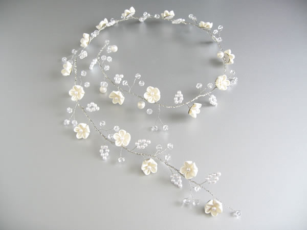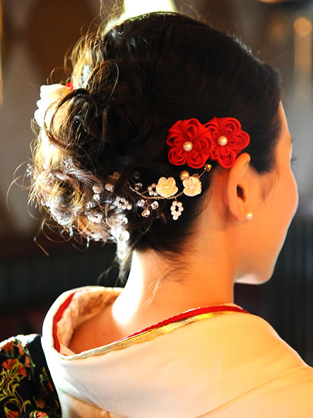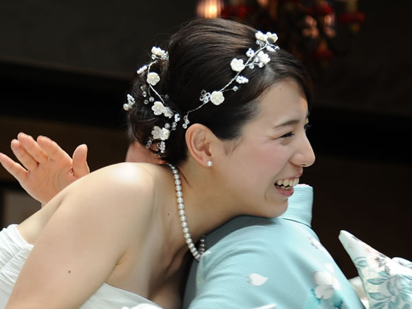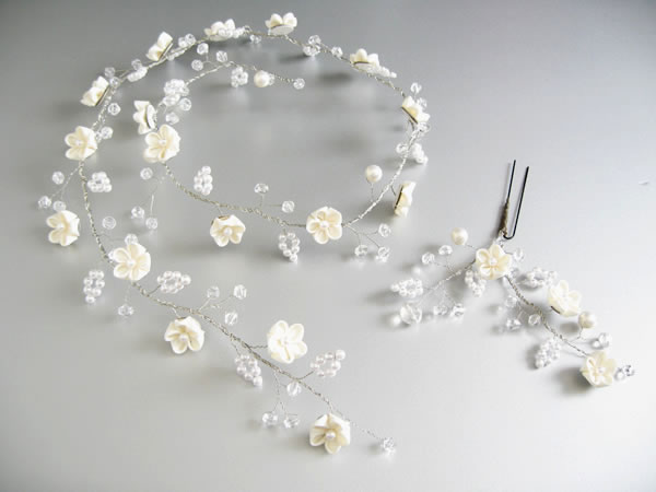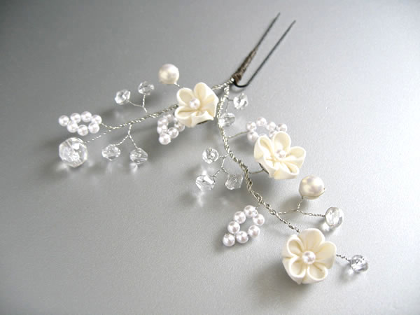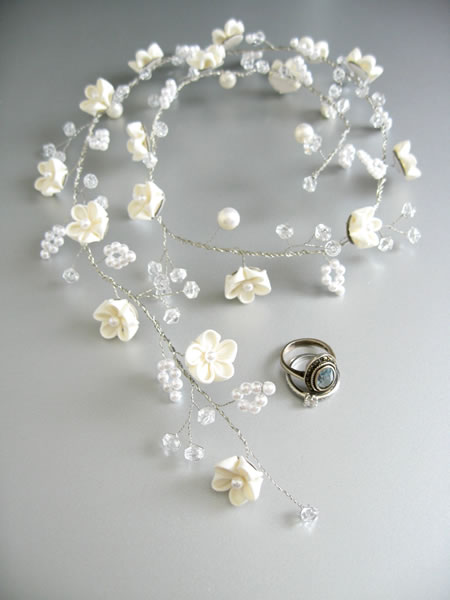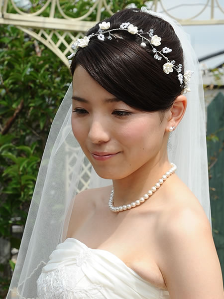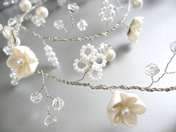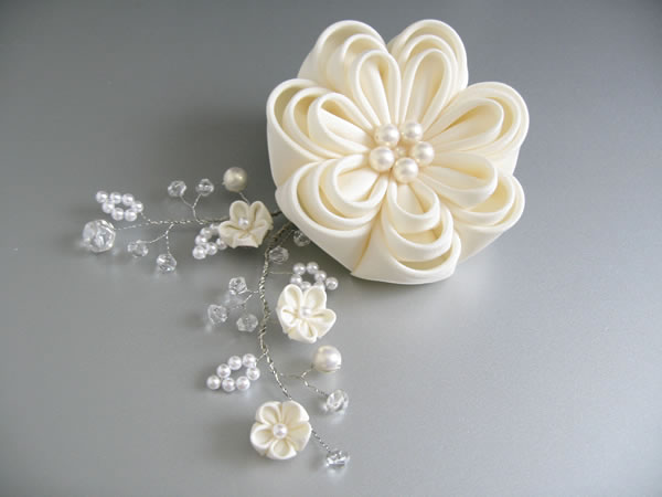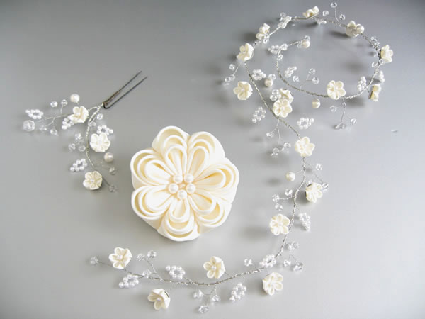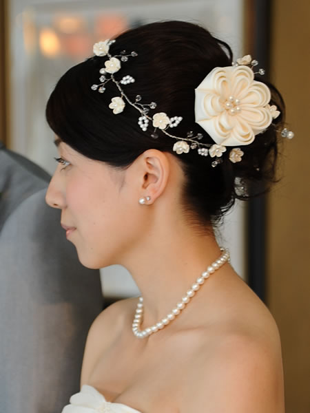 ウェディングドレスとお色直しのお振袖に合わせて髪飾りを作らせていただきました。新婦さんがショートカットのため、着けやすい様にラリエット風の髪飾りに初挑戦しました。白いビーズで作った「四葉のクローバー」も一つだけ忍ばせてあります。またコーム型の髪飾りの裏面は「Something Blue」の水色にし、幸せが重なっていくよう三重の花びらになっています。