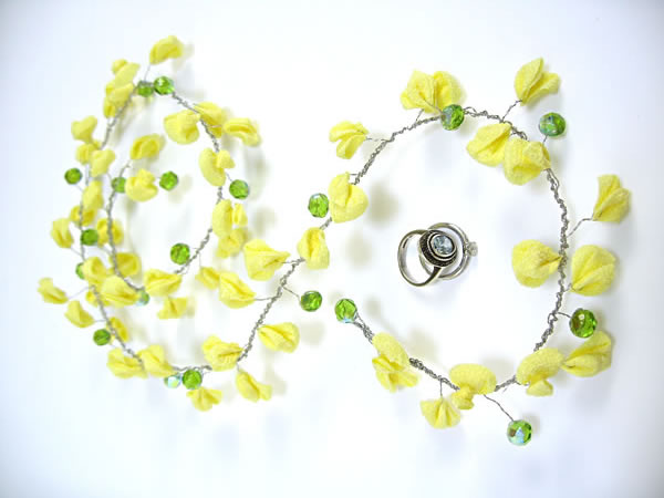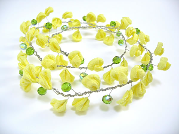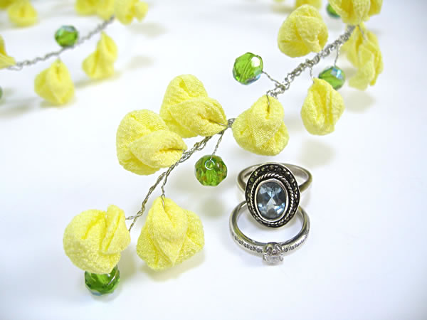ターメリックの黄色い花をラリエット風にするにあたり、花のデザインにとても悩みました。土台を使わないで花を作り、さらにそれをワイヤーで繋いでいく…うーん…うーん……お昼寝したらまた考えよう…と思い、ソファーでまどろんだ瞬間にアイデアが浮かびました!お昼寝って大事ですね!!