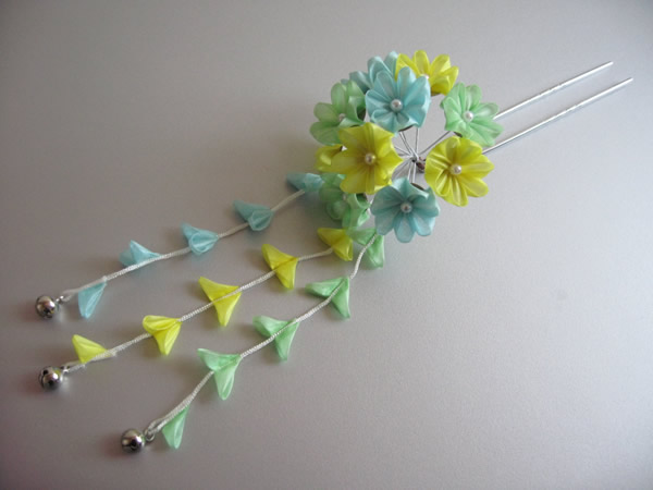 舞妓さんが着ける花かんざしをイメージして作りました。黄色や青系の振袖や小紋にも合います。枝垂れ分の先端に鈴が付いているので、動くたびに音がします。