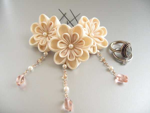 美容室で人気のUピンセットです。今回は、最近ドレスなどで人気のオフホワイト色の花にしてみました。金具もピンクゴールドの色にし、全体的に優しい雰囲気にしています。春を意識して、ビーズには淡いピンク色を使用しました。